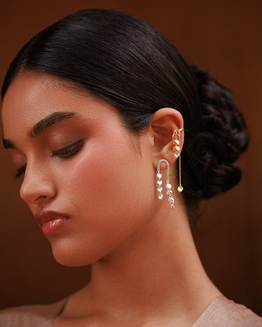 Elevate your ear stack with the “Husn” Ear Cuff - a refined, non-pierced accessory that channels quiet luxury. Crafted with a secure cuff, it features a graceful chain and peepal patti-shaped leaf elements for a soft yet striking effect. Husn - translating to "beauty" - is available in gold and silver finishes, designed to be worn solo or layered for a personalized, high-impact style.