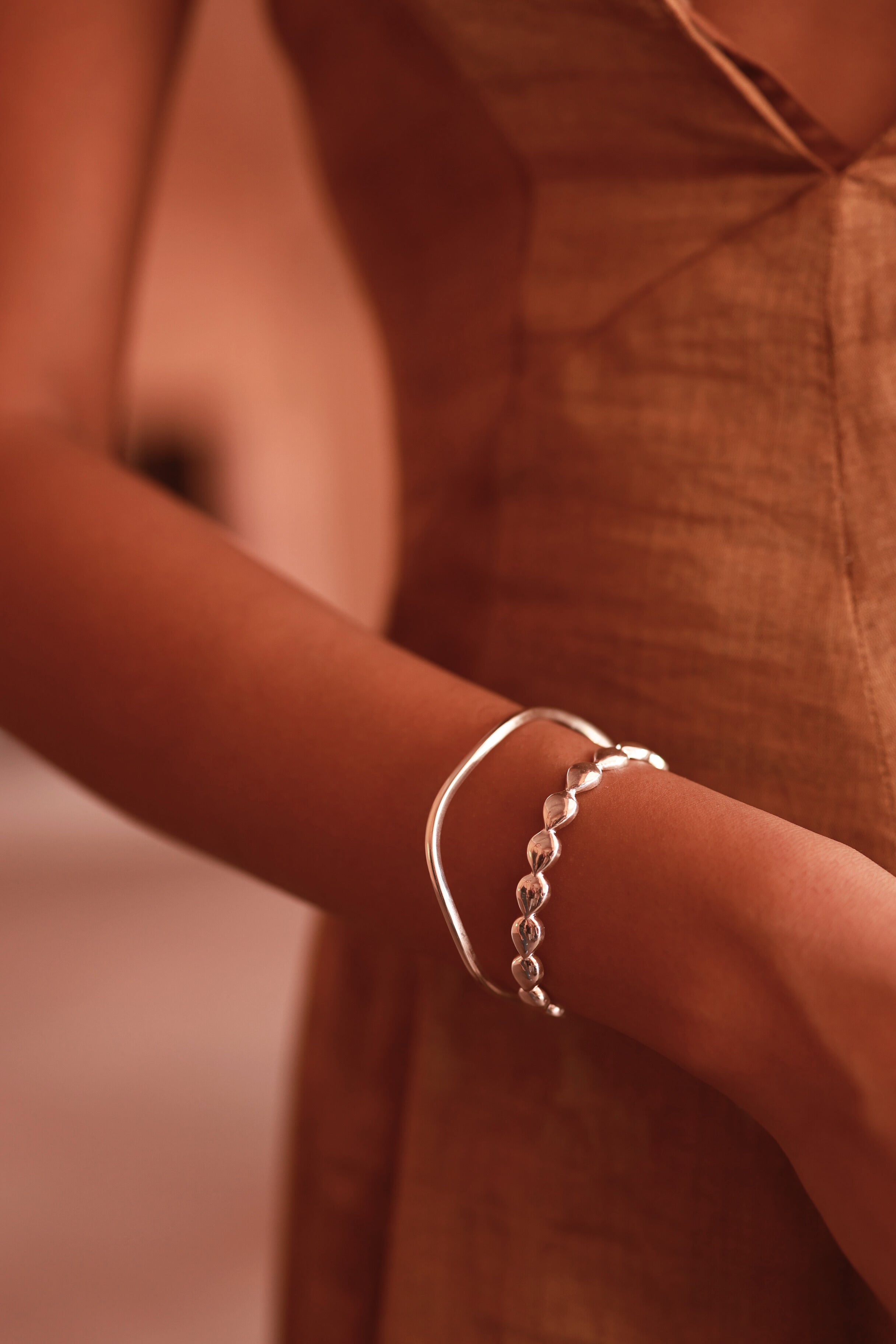 Adaa is a sculptural cuff bracelet that wraps around the wrist in a graceful sequence of peepal patti leaves. Each leaf folds gently into the next, creating a seamless braid of silhouettes that appear both fluid and structured. It hugs the wrist with a soft strength, offering elegance without ornament, boldness without weight. Adaa is not just an accessory -  it’s a sculpture for the body, a celebration of femininity in its most refined and effortless form..