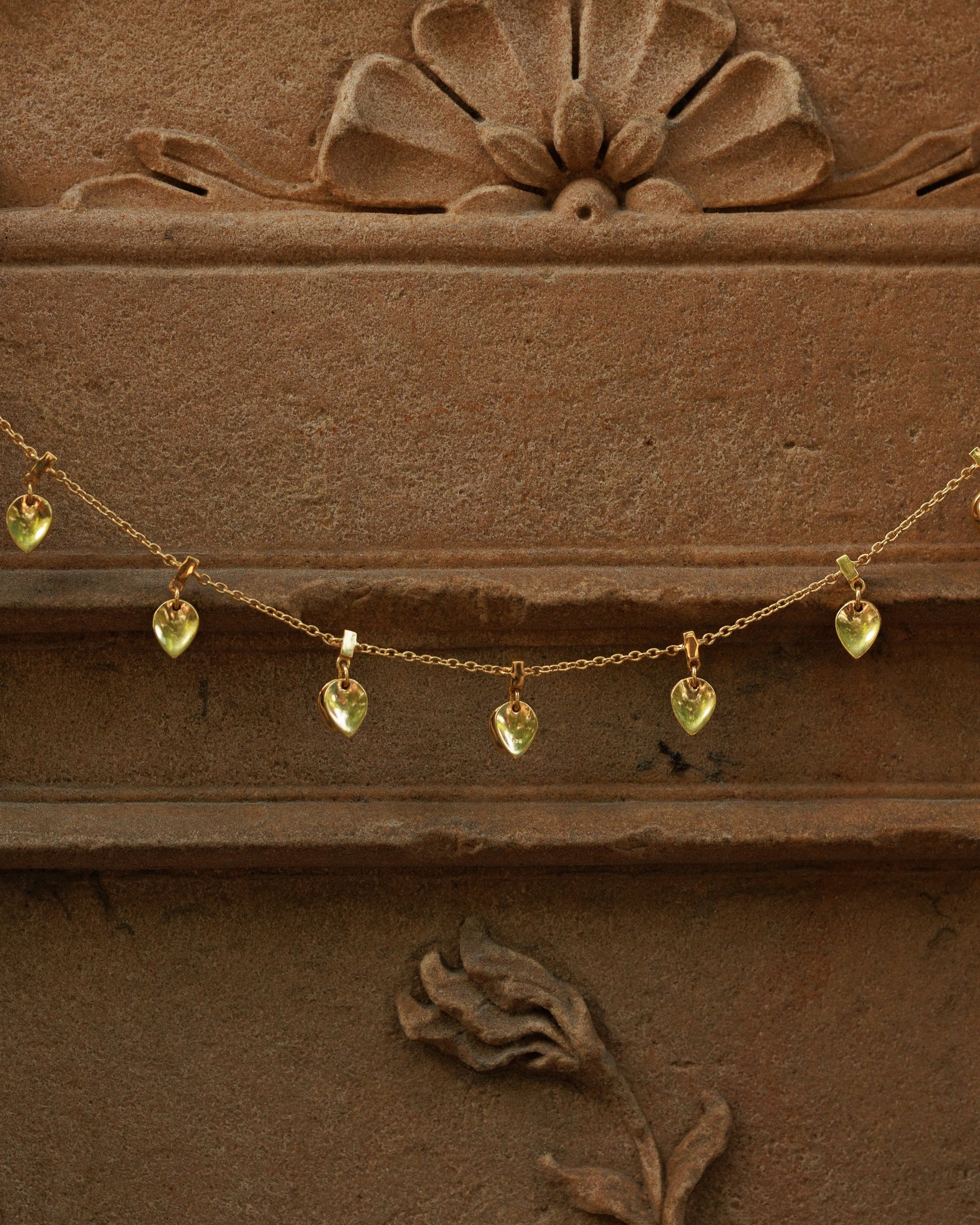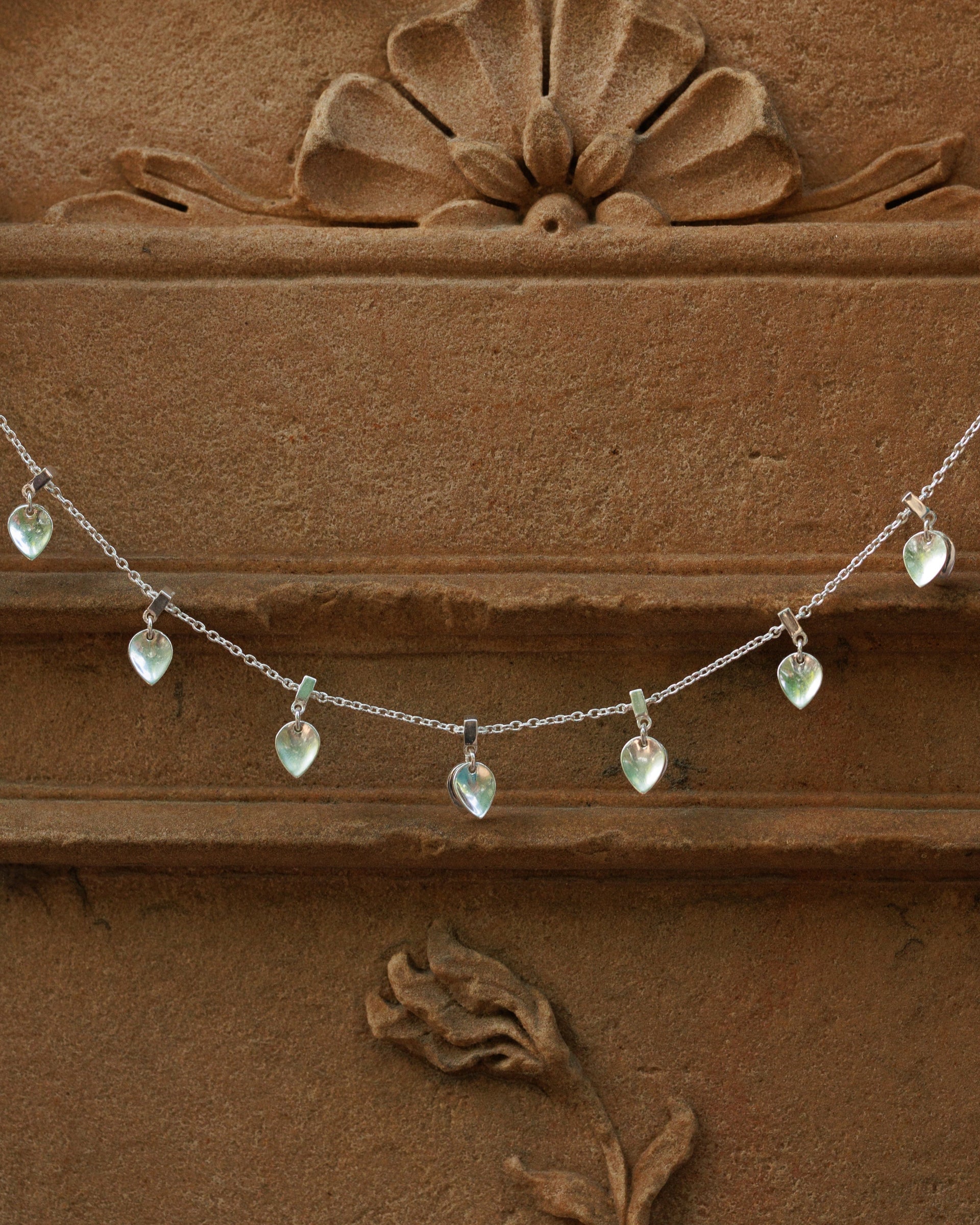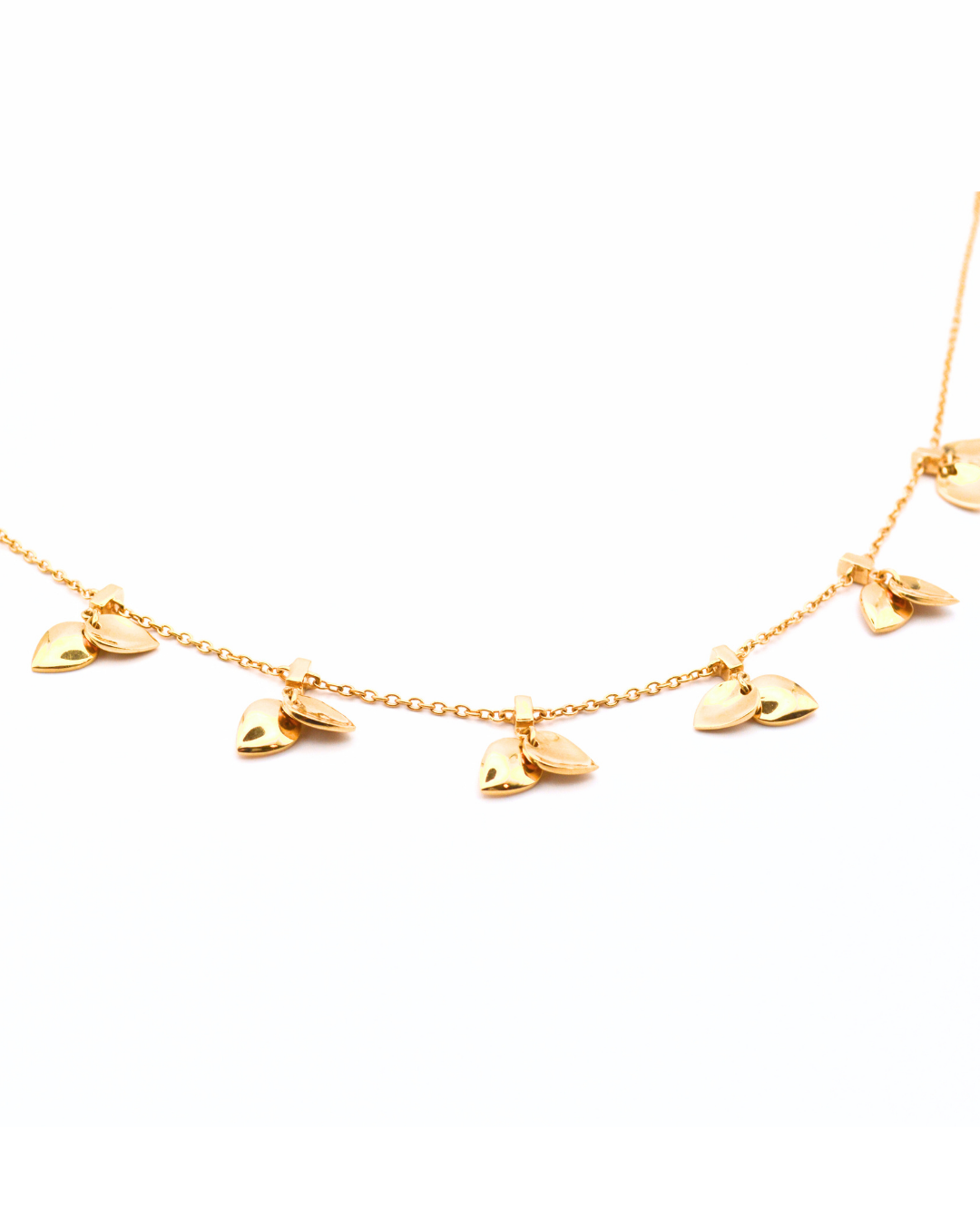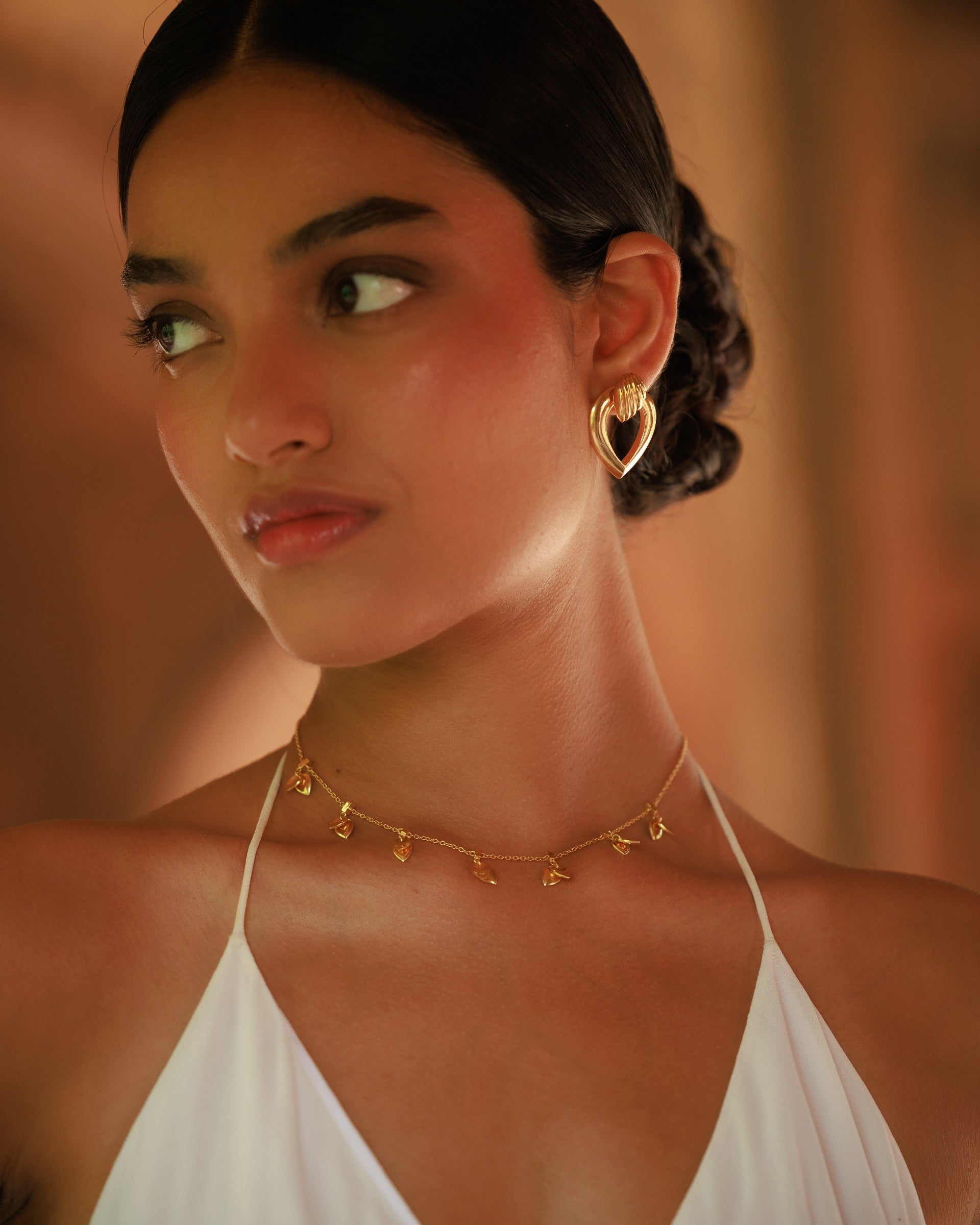 The “Gul” necklace is a delicate celebration of nature’s quiet poetry. Suspended on a fine chain of radiant gold or silver, it features a series of peepal leaf motifs, each gracefully anchored by a cylindrical connector. The name Gul, meaning “flower,” is embodied in its gentle rhythm and organic silhouette. Light and fluid, the necklace dances with every movement, whispering femininity and calm confidence. Whether worn as a daily adornment or a subtle statement paired with one of the matching earrings, Gul invites elegance into every moment.