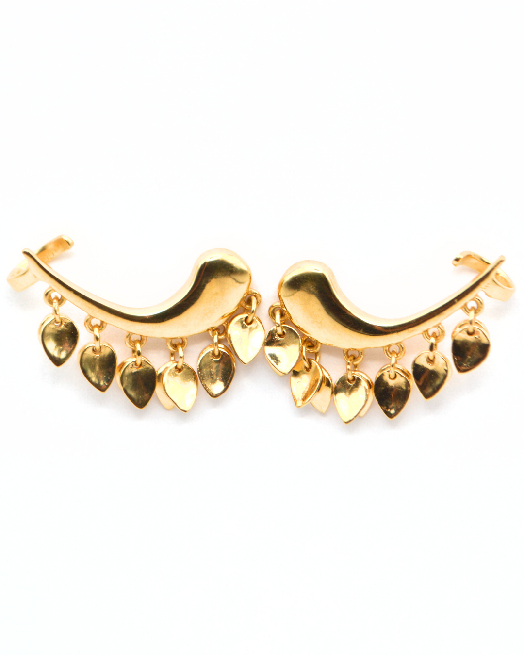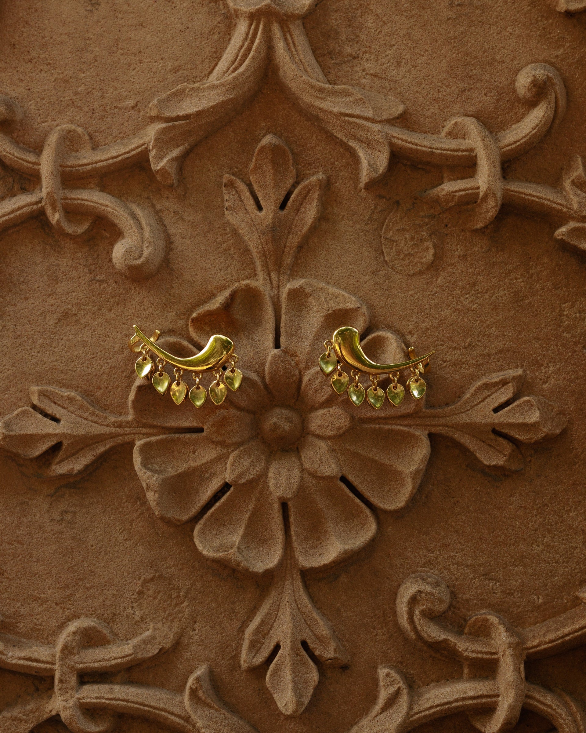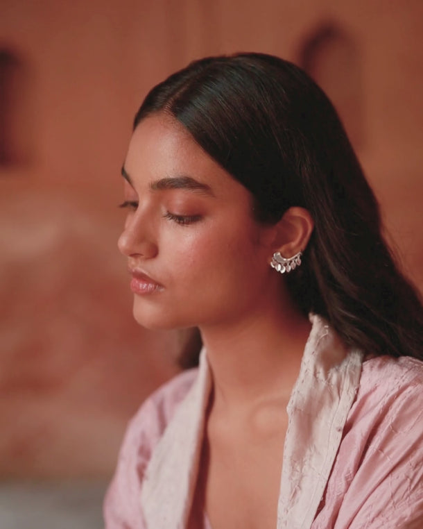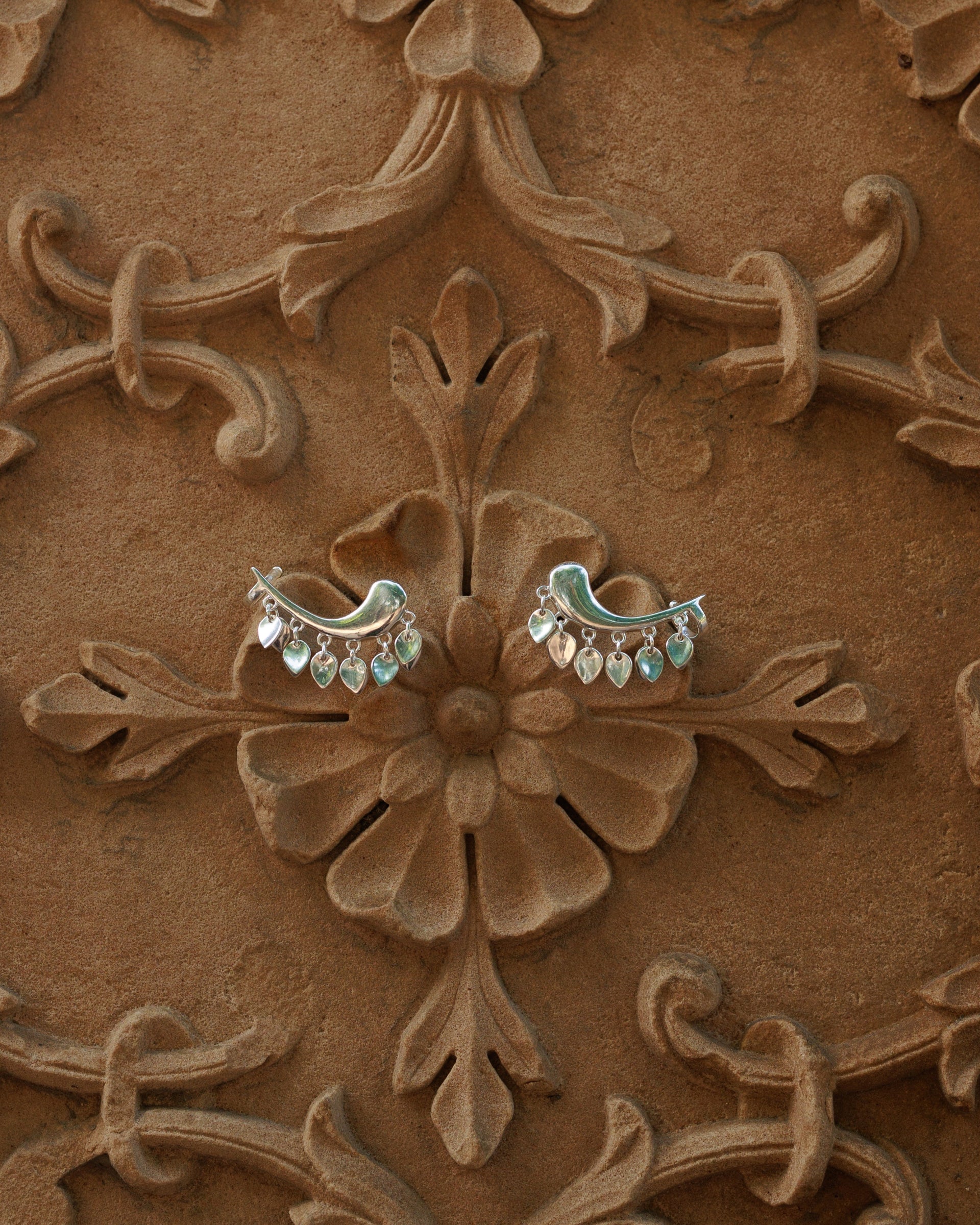 True to its name, the “Hunar” earring - meaning craft - is a beautifully designed ear climber that showcases exceptional craftsmanship. It features a sleek, curved centerpiece secured with a cuff at the top. Gracefully hanging from the bottom are delicate peepal patti shaped leaves that gently brush the earlobe as they ascend. Available in both radiant silver and rich gold finishes, this striking piece is the perfect accessory to elevate any evening look.