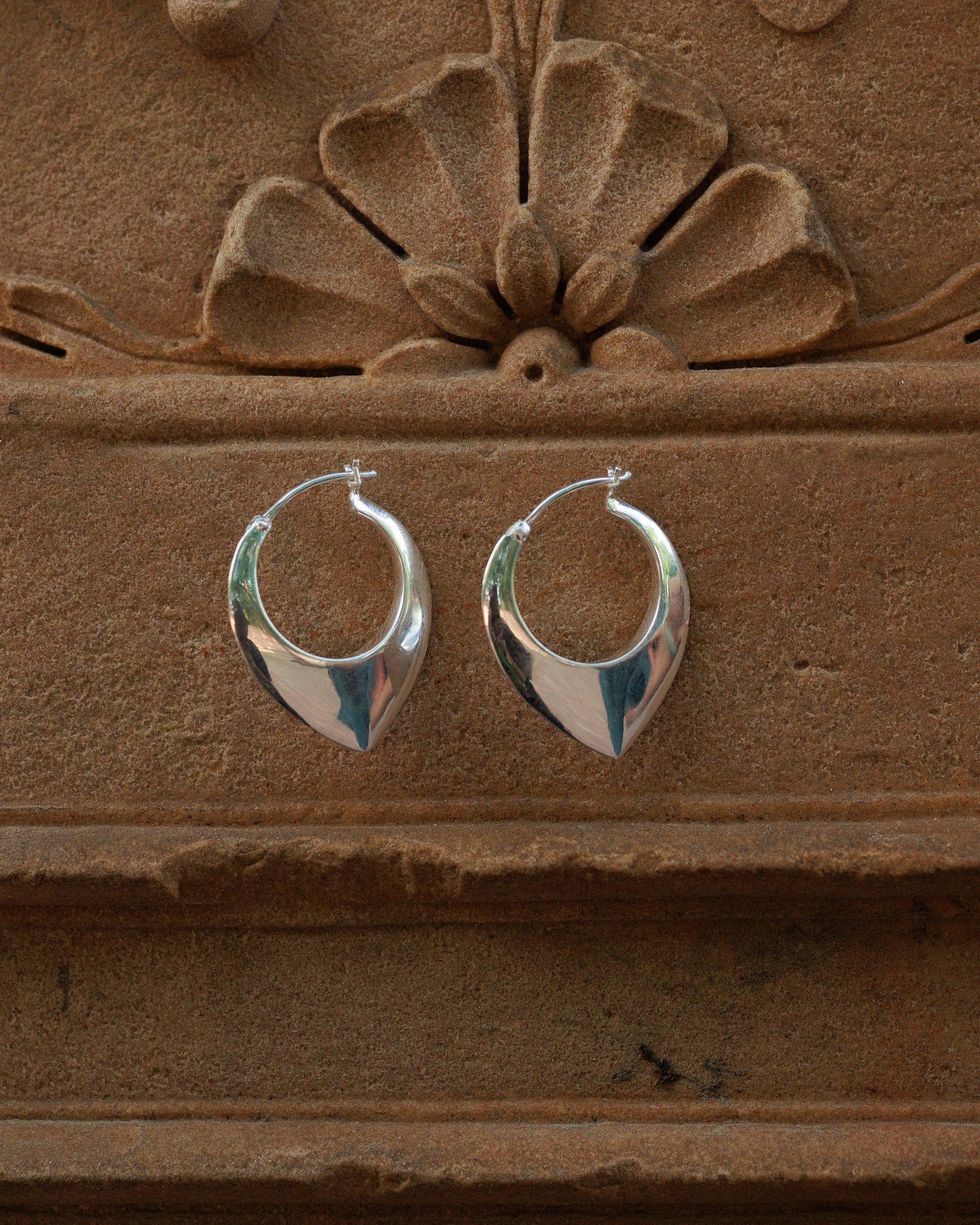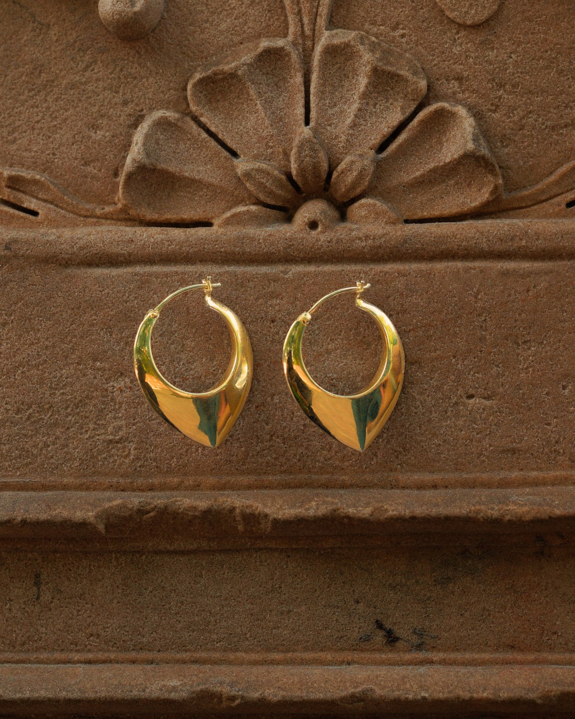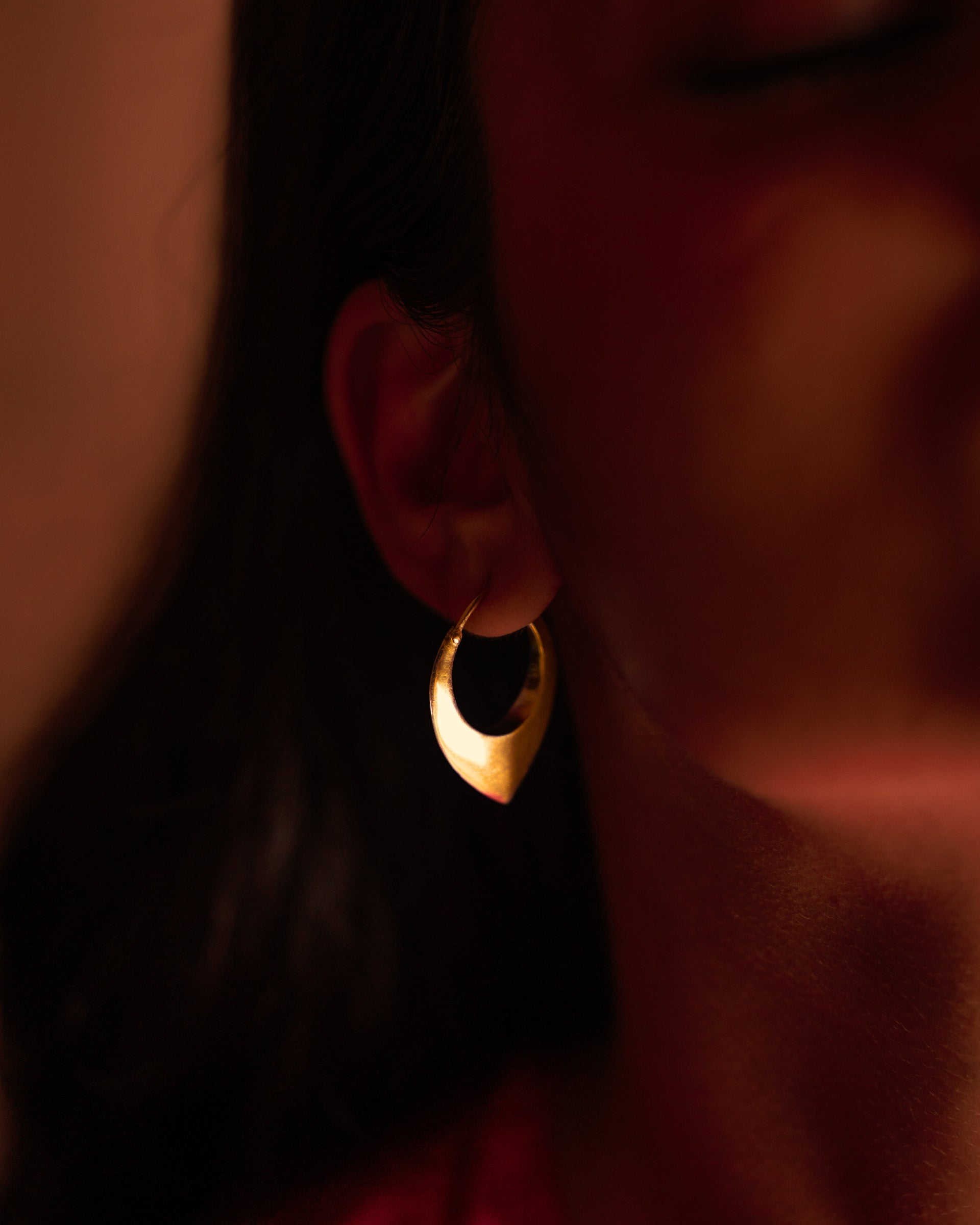 The “Noor” hoop earrings are a striking fusion of minimalism and bold elegance. Crafted in both silver and radiant gold finish, they feature a unique open crescent design that gracefully tapers into a pointed peepal leaf. Lightweight yet impactful, the “Noor” earrings are named after the Urdu/Punjabi word meaning light - and true to their name, they illuminate your look with a modern glow.