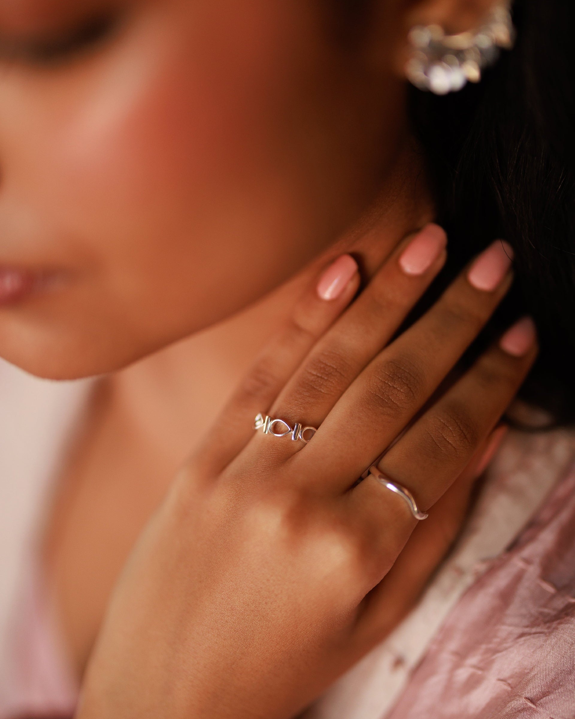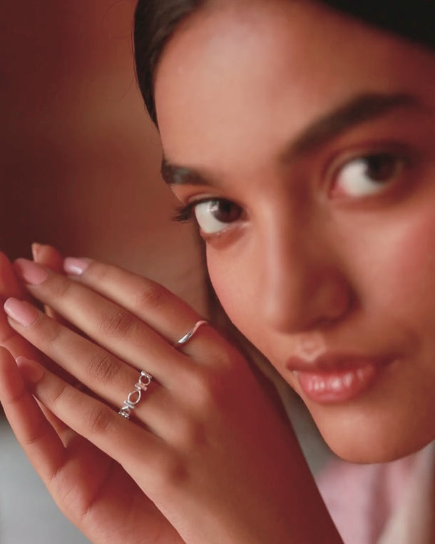 The “Sanjh” ring is a bold yet elegant piece that echoes the motifs of its namesake collection. Crafted in radiant silver and luminous gold, it features open peepal leaf shapes linked by cylindrical connectors in a continuous loop. Balancing softness with structure, the design symbolizes harmony between tradition and modernity. Its rhythmic repetition feels meditative, embodying Sanjh - “sacred bond” - and reflecting unity and timeless ties. Worn alone or with the matching bracelet and necklace, it is a refined statement of simple form and profound meaning.