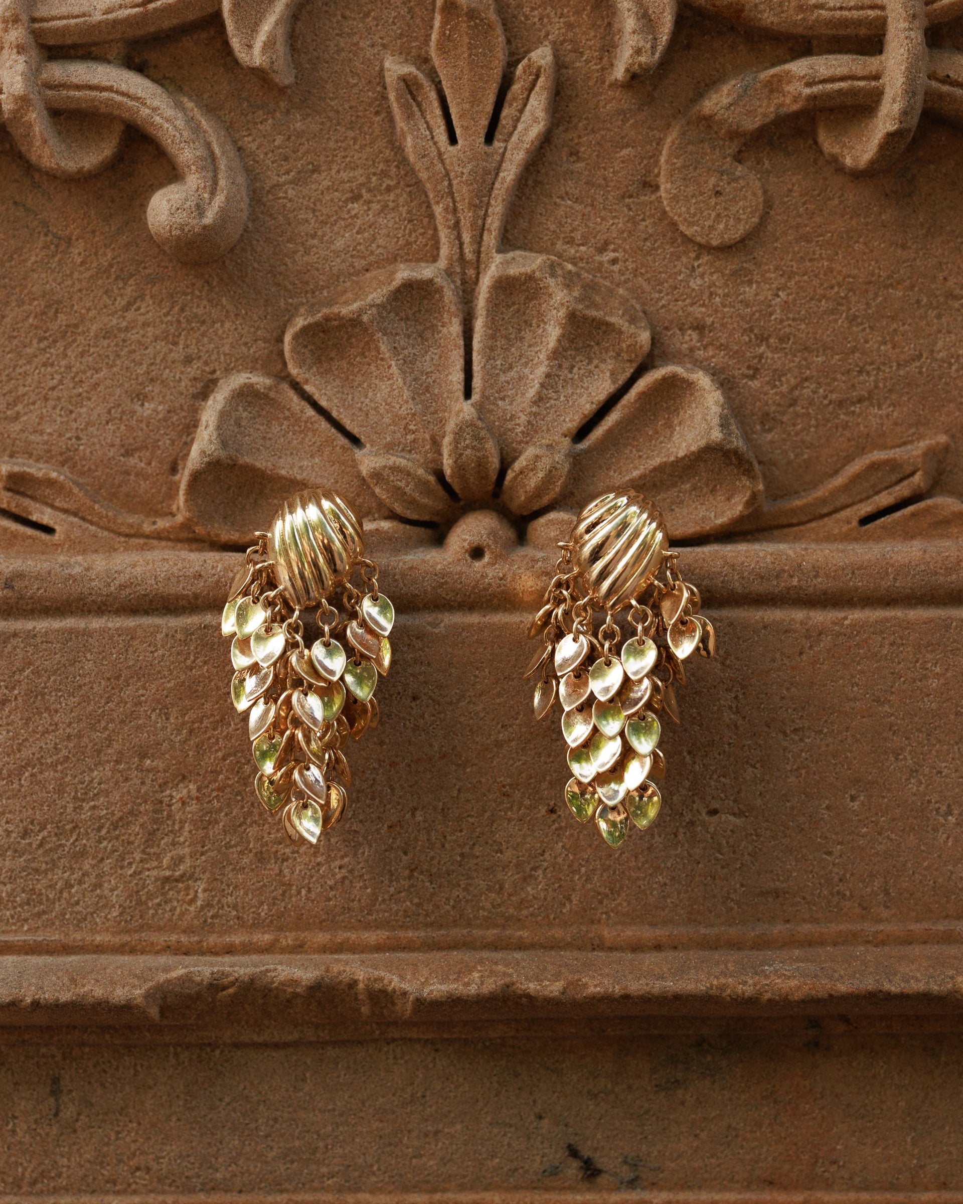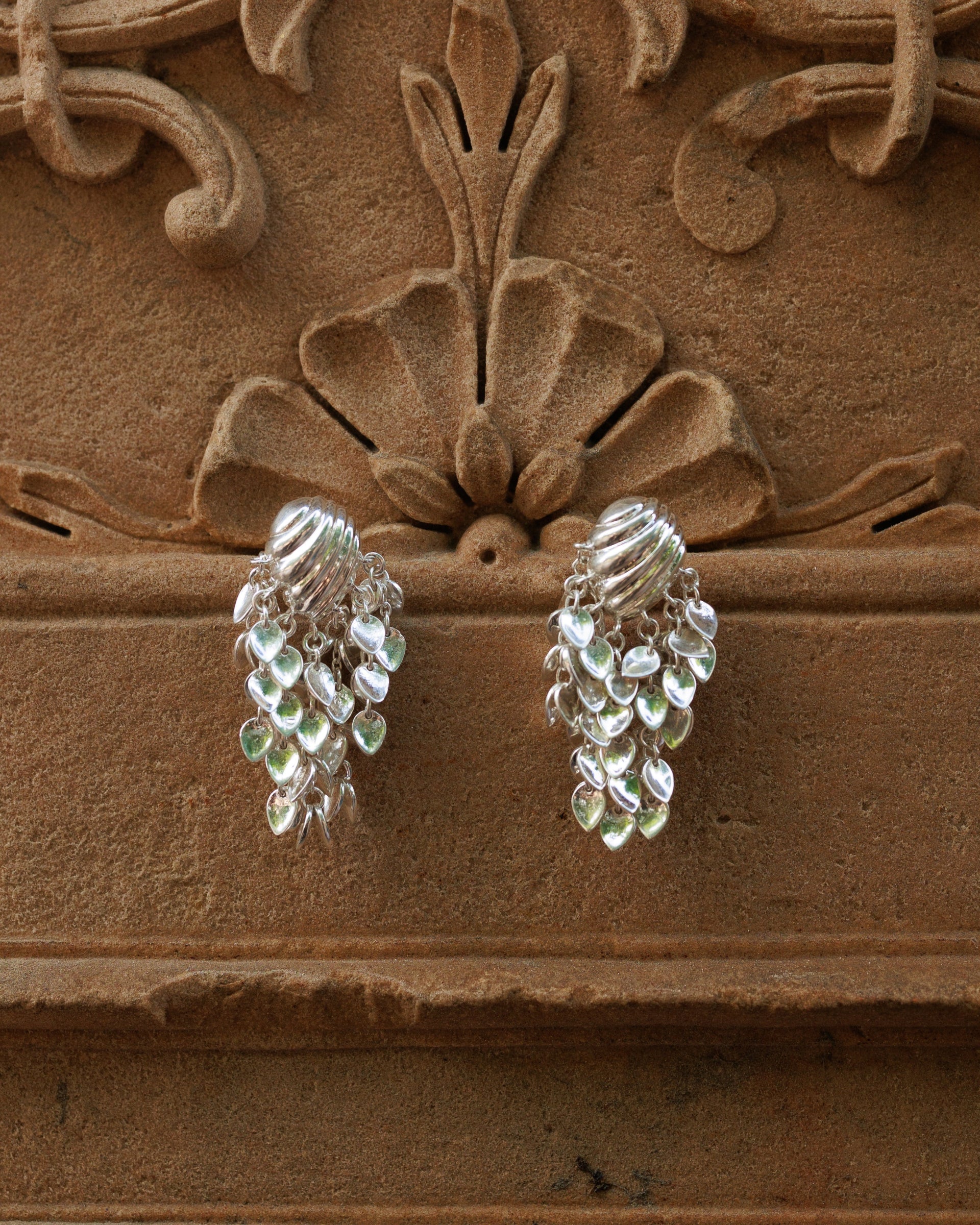 Rooted in nostalgia, the “Yaad” Earrings are a homage to the enduring spirit of a grandmother whose energy lit up every room. Echoing the charm of a vintage heirloom from the 60s-70s, this design features a bold, textured oval stud paired with graceful peepal leaf cascades. Available in polished gold and silver, Yaad adds a timeless, memory-laced glow to any elegant ensemble.